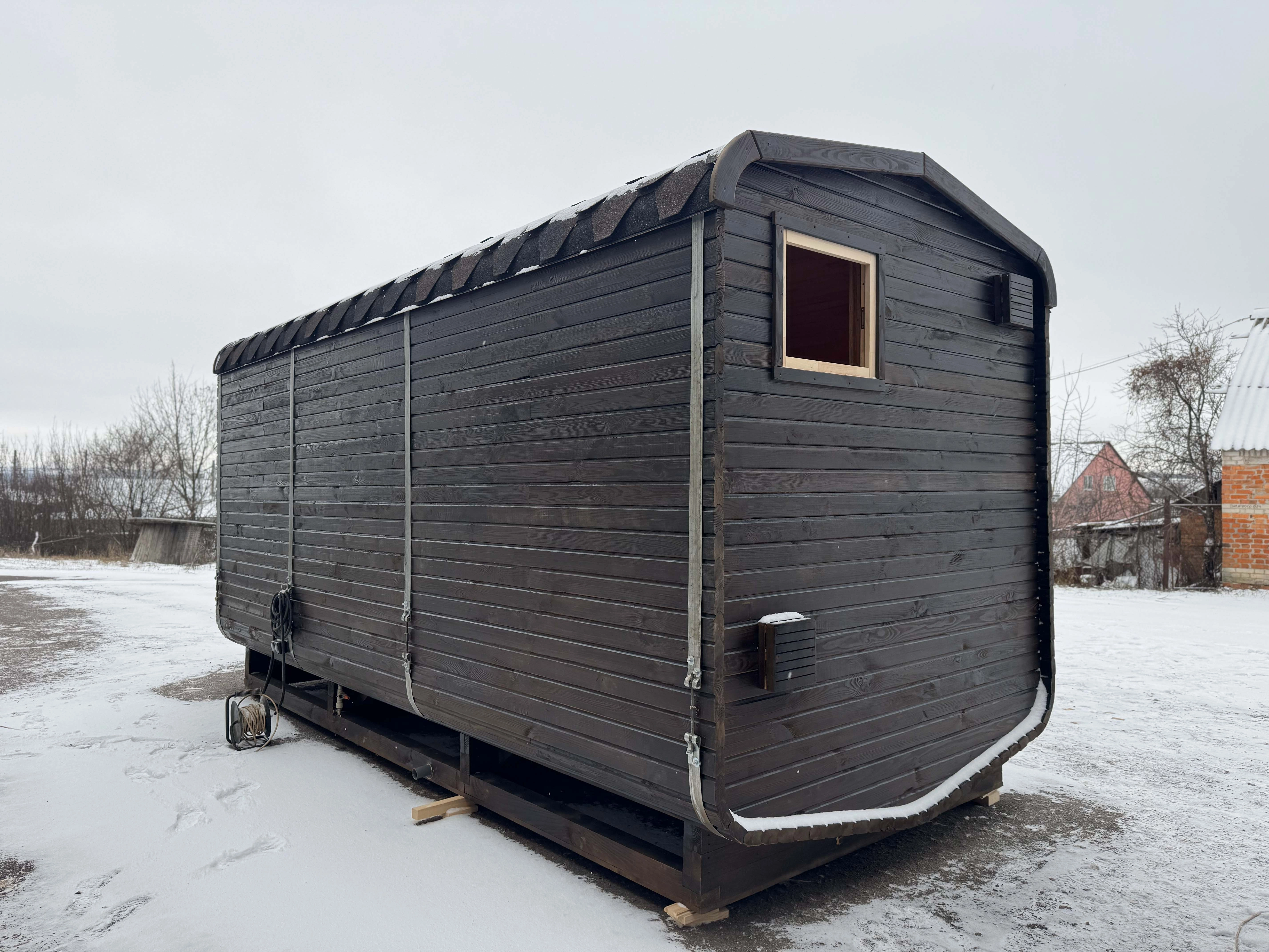 Бітумна черепиця до 30 років, з килимовою підкладкою, капельниками, мастикою та гумка на трубу. (Це збільшую термін служби бані, та не дає потрапити смолі на дерево при високих температурах)